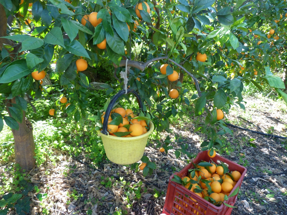 Tramite delle forbici tagliamo il peduncolo di ogni singola arancia, le depositiamo in un paniere che teniamo vicino appeso in un ramo e quando è pieno lo svuotiamo in delle cassette di plastica arieggiate; questa operazione richiede molta esperienza e fatica.